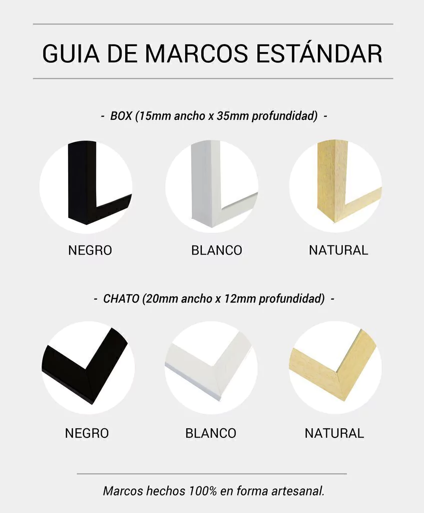Los marcos son realizados 100% en forma artesanal por nuestro taller. Las opciones estándar son en madera natural marupá o en color blanco / negro. Las variantes son chata de 2cm y Box (1,5cm de ancho x 3,5cm de profundidad). Si buscás otro marco y/o medida consultanos.
